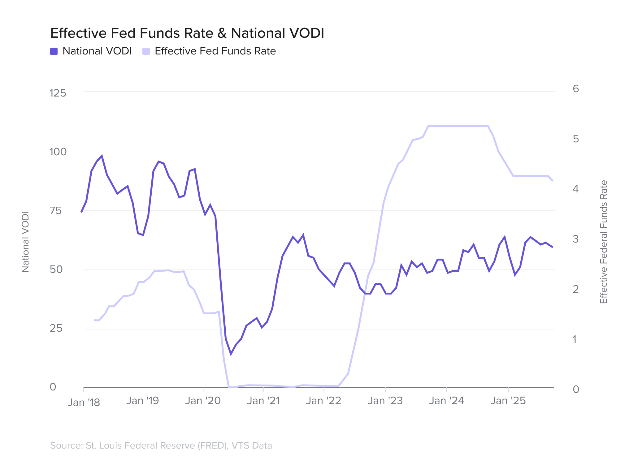 The VODI softened in Q1 2025. Although the index ended the quarter at 68—up a modest 4.6% from a year earlier—that figure masks declines in January and February that ended a 20-month streak of year-over-year growth.