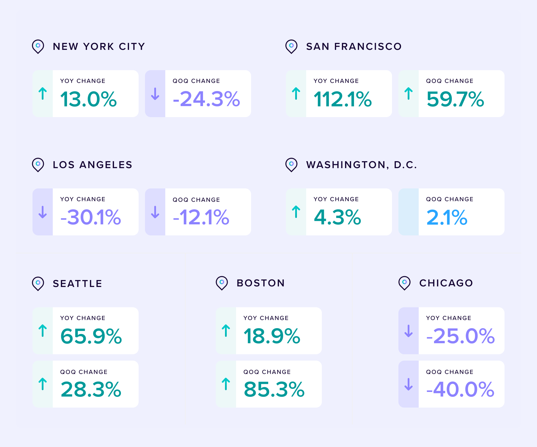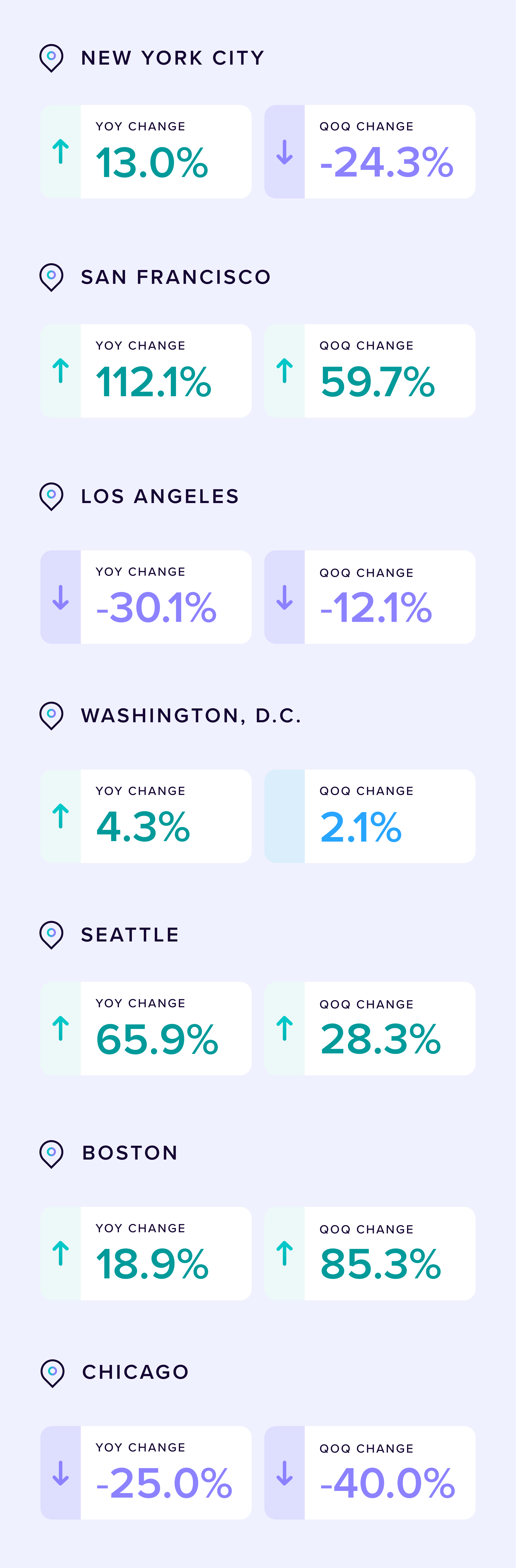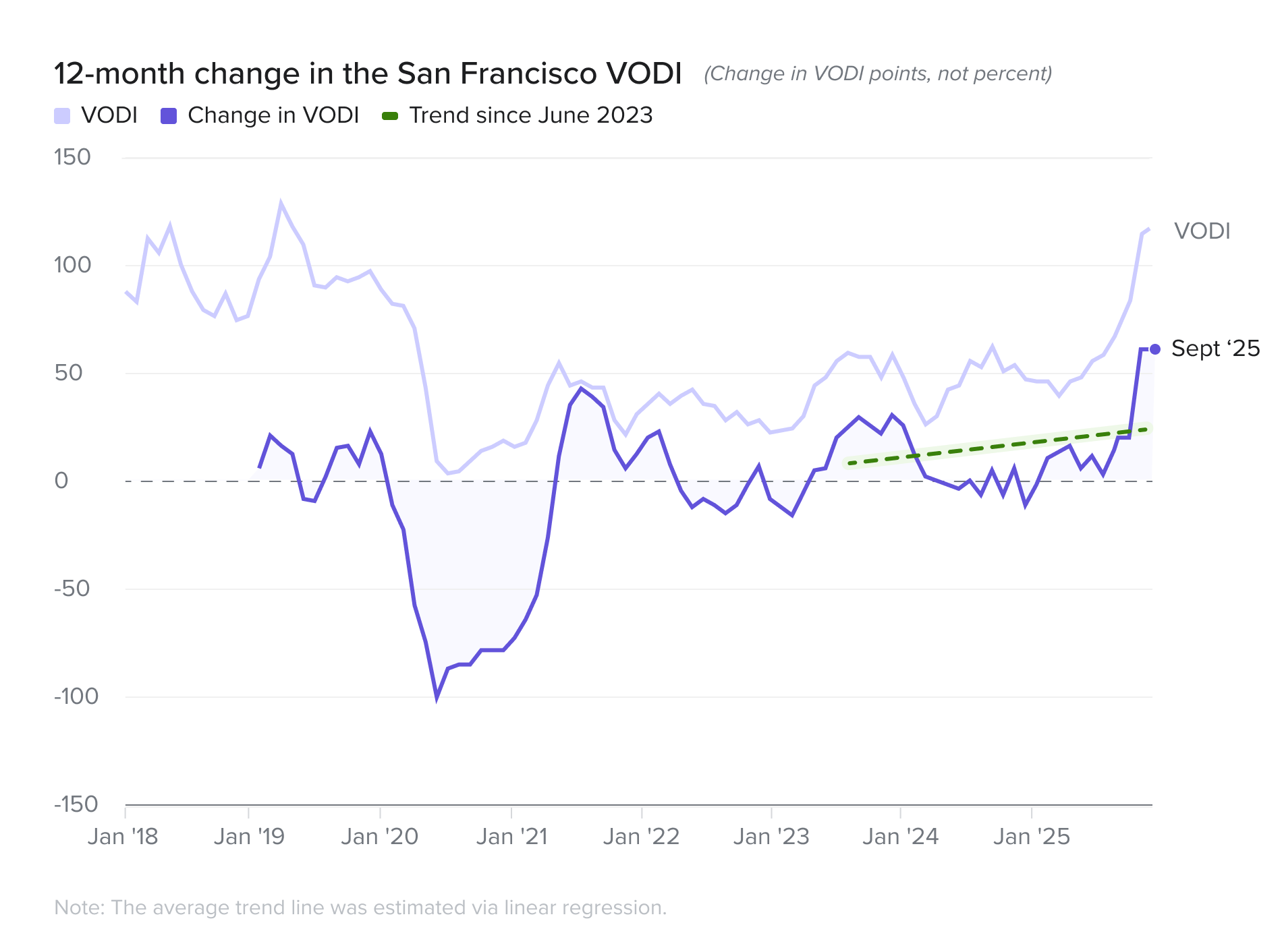 San Francisco also showed strong momentum, with its VODI rising 27.3 percent year-over-year and surging 40 percent since the end of Q1, fueled by a rebound in tech demand that continues to be led by the push in AI.