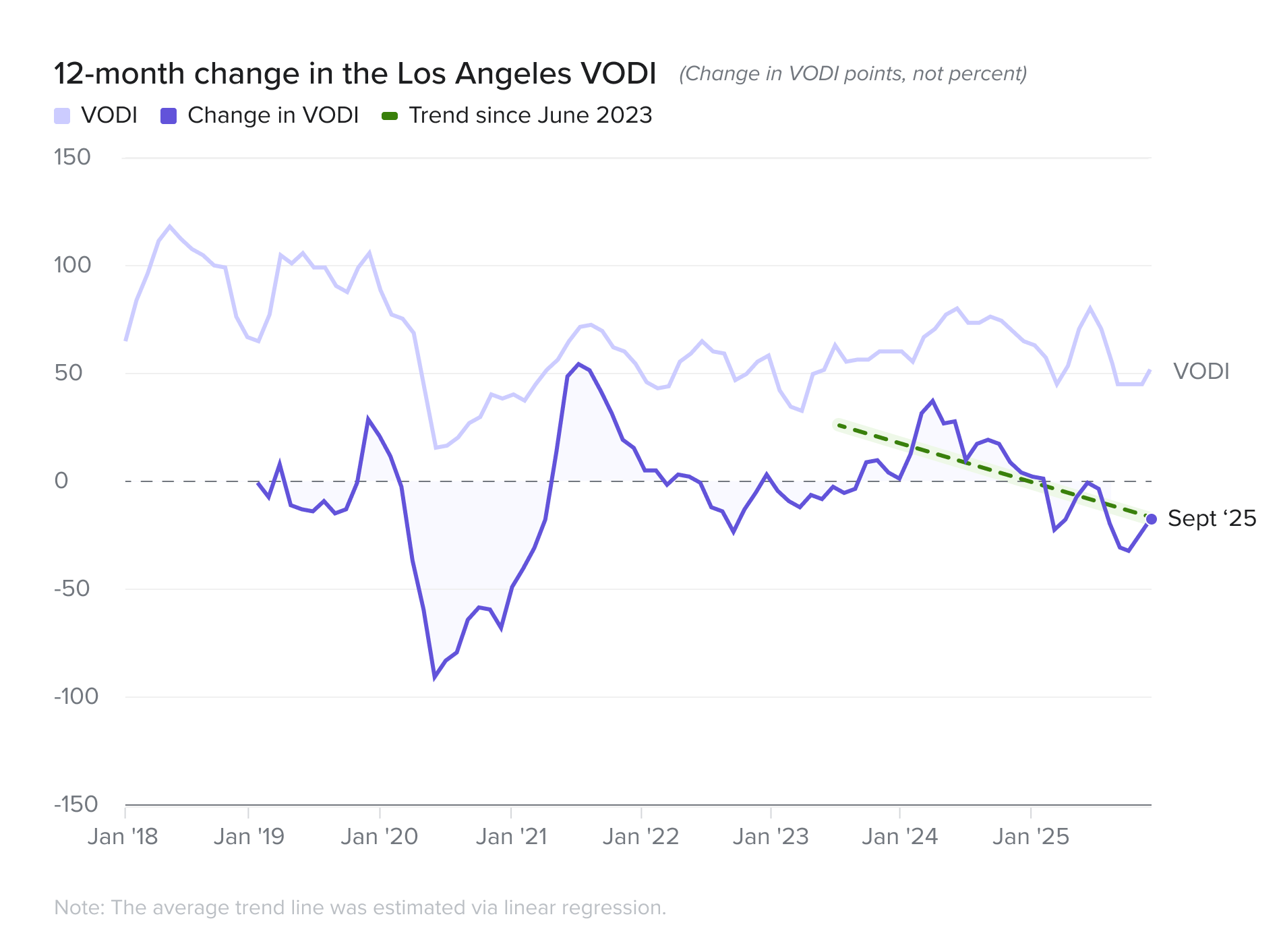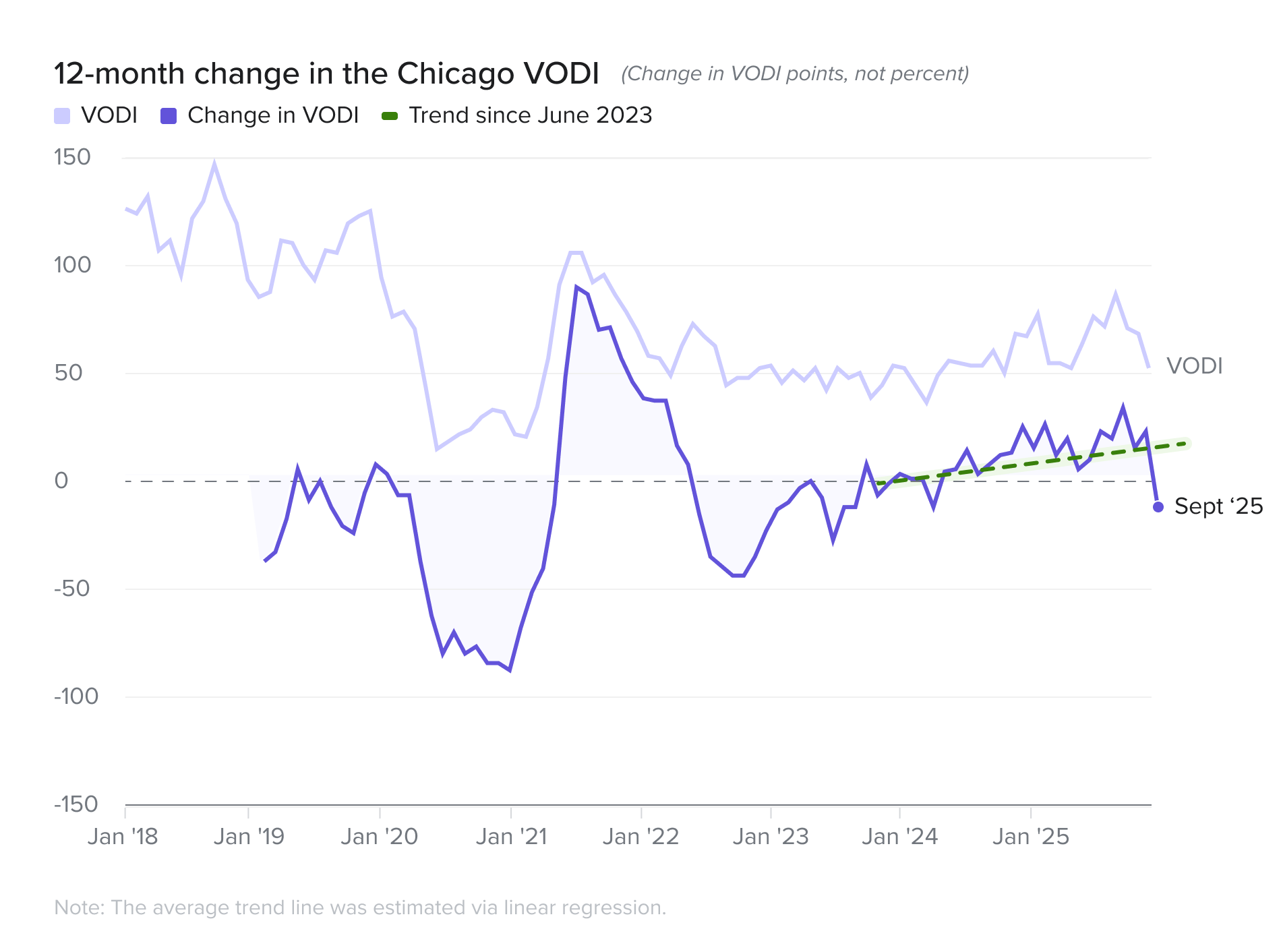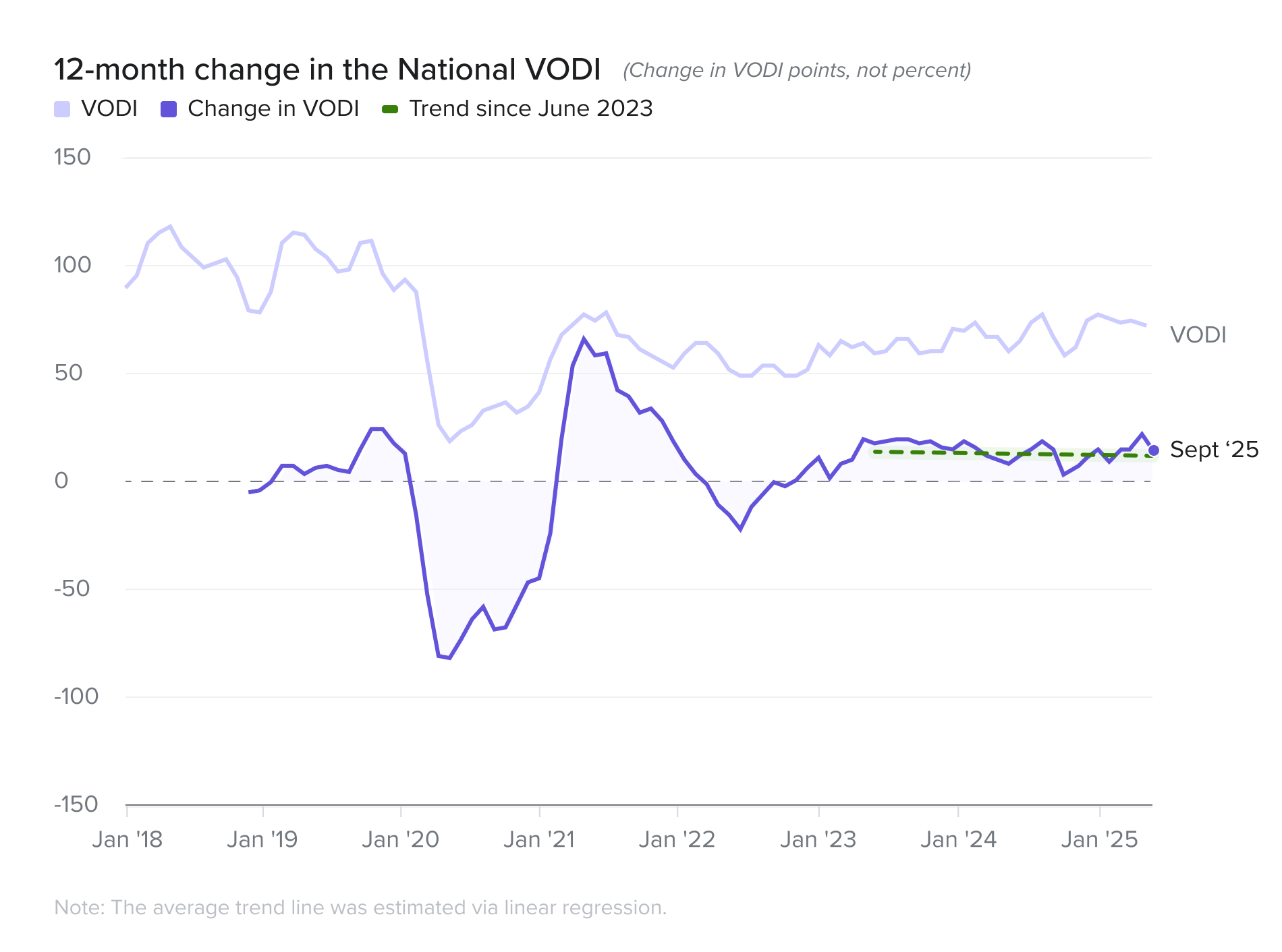 Since October 2021 the VODI has been seemingly stagnant. It trended downward slightly in the earlier part of the period, and bottomed out in late-2022 and early-2023. Since then, it has slowly begun gaining new momentum.