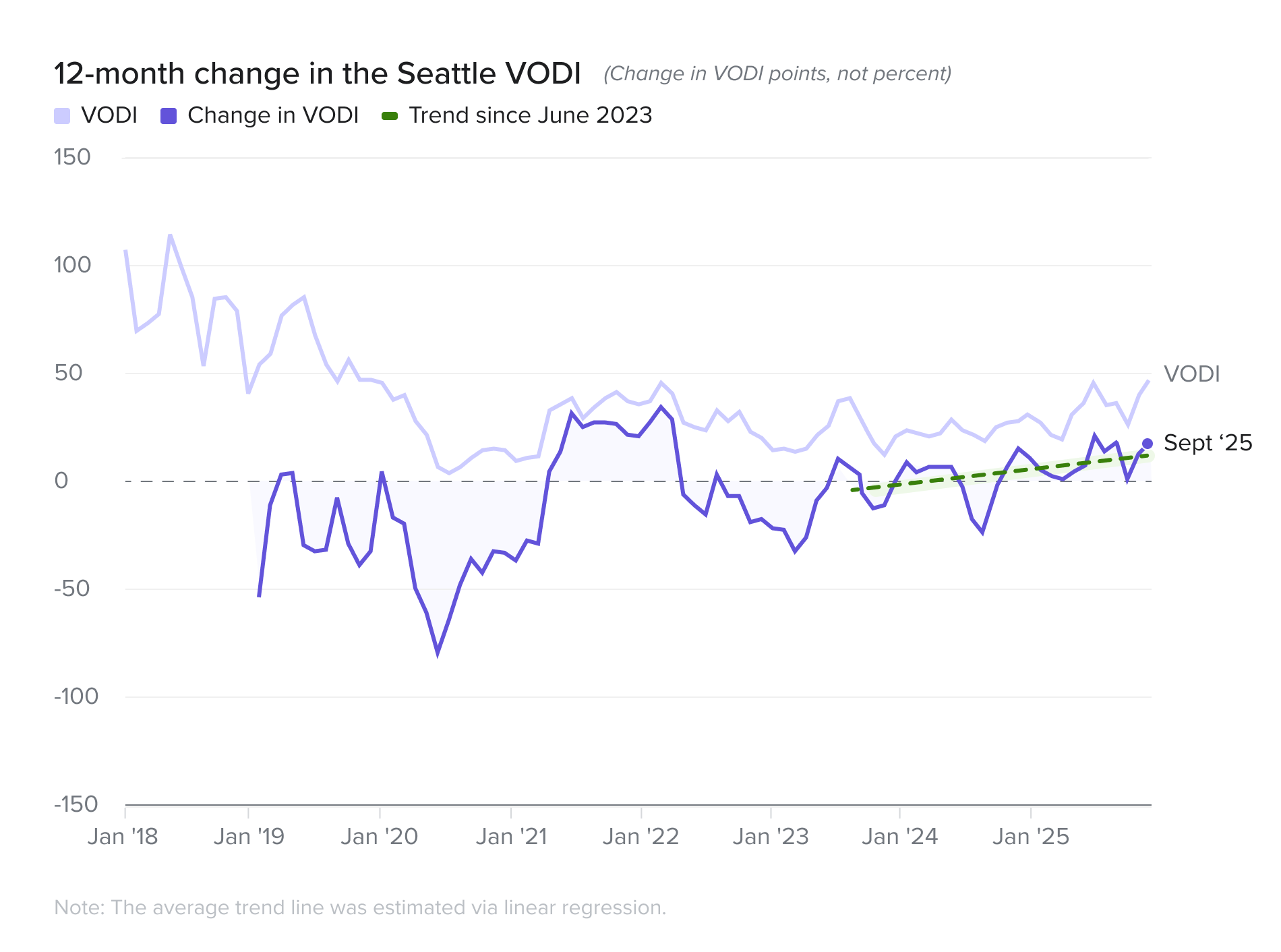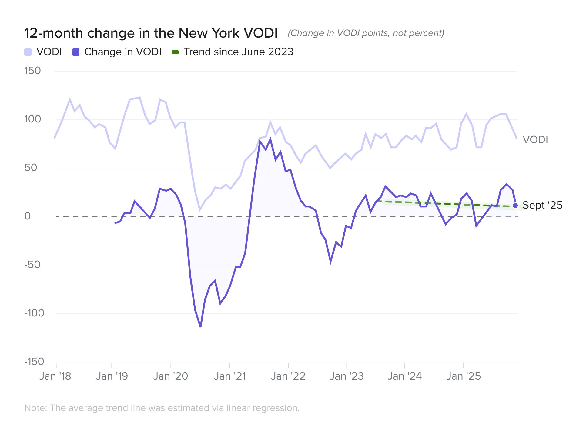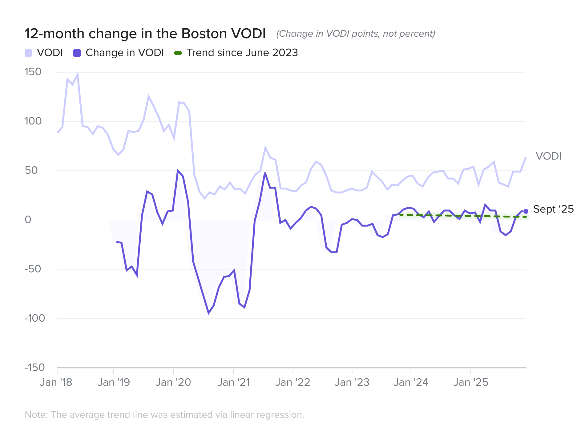 Since October 2021 the VODI has been seemingly stagnant. It trended downward slightly in the earlier part of the period, and bottomed out in late-2022 and early-2023. Since then, it has slowly begun gaining new momentum.