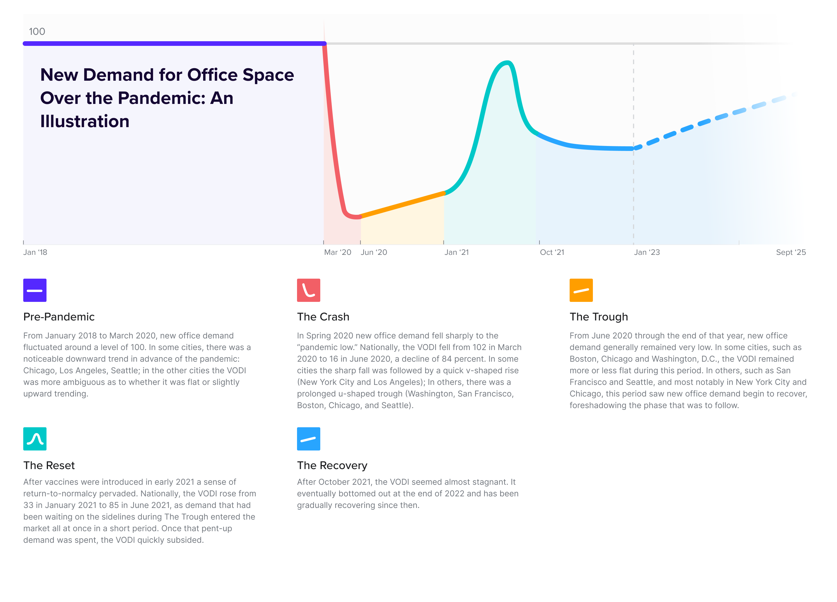 In Spring 2020 new office demand fell sharply to the “pandemic low.” Nationally, the VODI fell from 102 in March 2020 to 16 in June 2020, a decline of 84 percent. In some cities the sharp fall was followed by a quick v-shaped rise (New York City and Los Angeles); In others, there was a prolonged u-shaped trough (Washington, D.C., San Francisco, Boston, Chicago, and Seattle).