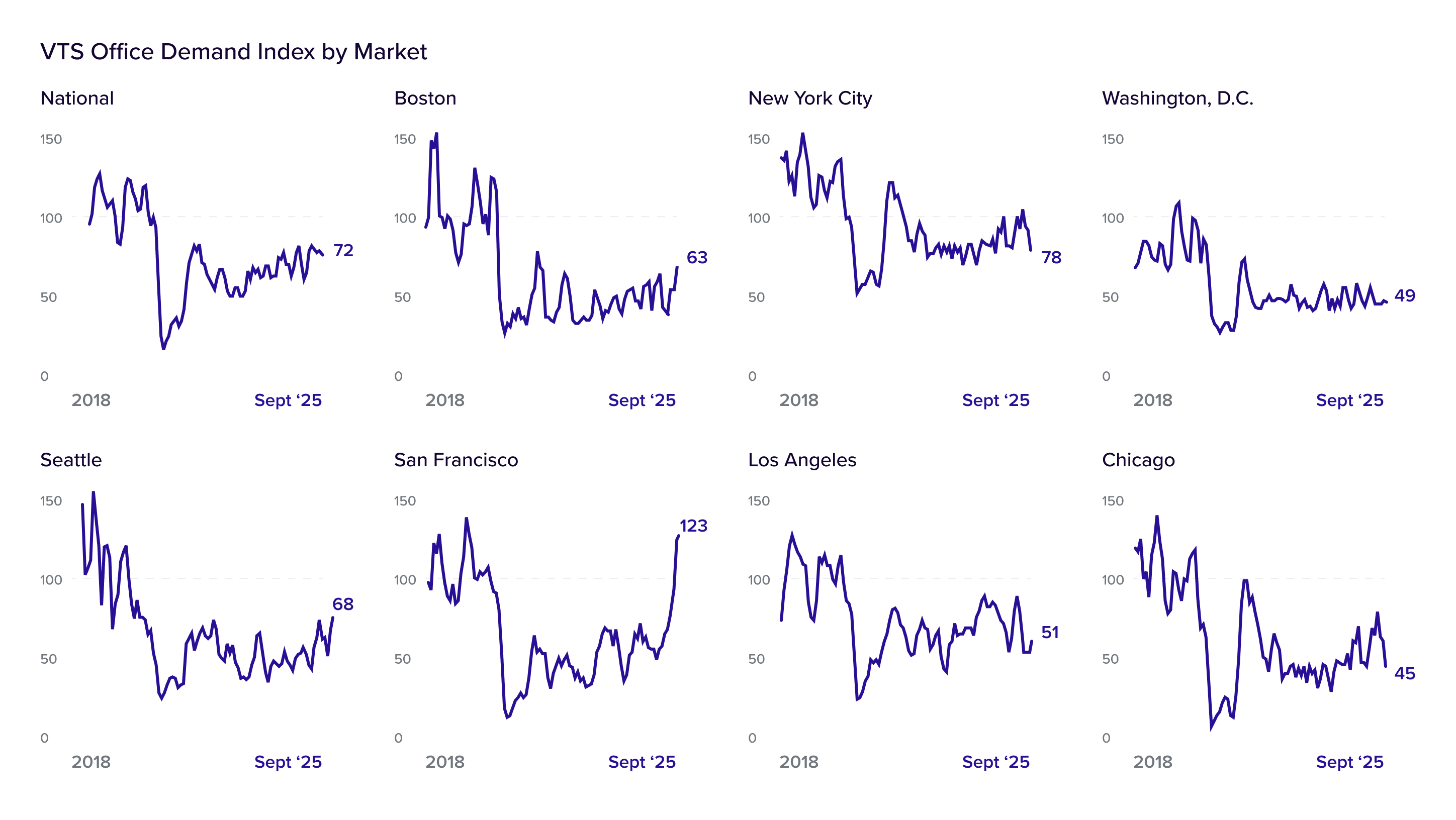 The national VTS Office Demand Index (VODI) finished Q3 2025 at 72. While this is a strong 16 percent year-over-year increase, it marks a four percent decline from Q2 2025 as uncertainty in the macroeconomic environment has crept in. This cooling coincides with a labor market that was already moderating, with the August 2025 unemployment rate at 4.3 percent, up slightly from June 2025 (4.1 percent) and the prior year (4.2 percent). The federal government shutdown has compounded this uncertainty by delaying the release of September's jobs report, leaving the country without a clear, real-time picture of the labor market's health.