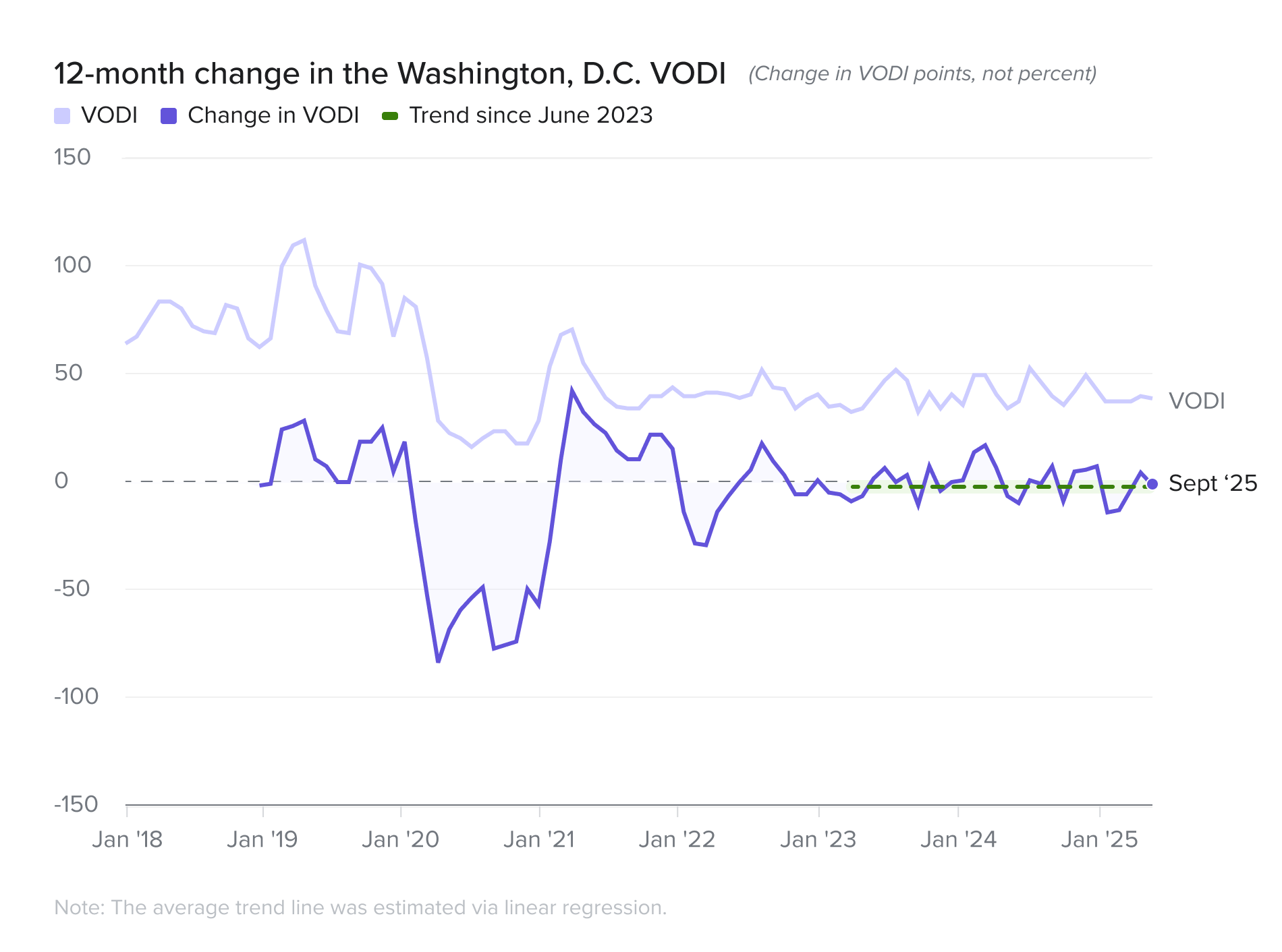 Washington, D.C.'s VODI posted a modest 2 percent quarterly gain to 49. However, this masks a concerning trend. The market's core demand drivers, Association/Nonprofit and Government, declined by 34 percent and 9 percent quarter-over-quarter, respectively. The market was held in positive territory only by cyclical gains from the Finance and Legal sectors. This means Washington, D.C. entered the federal government shutdown with its primary, most stable demand drivers already in retreat, making it uniquely vulnerable to a prolonged impasse.