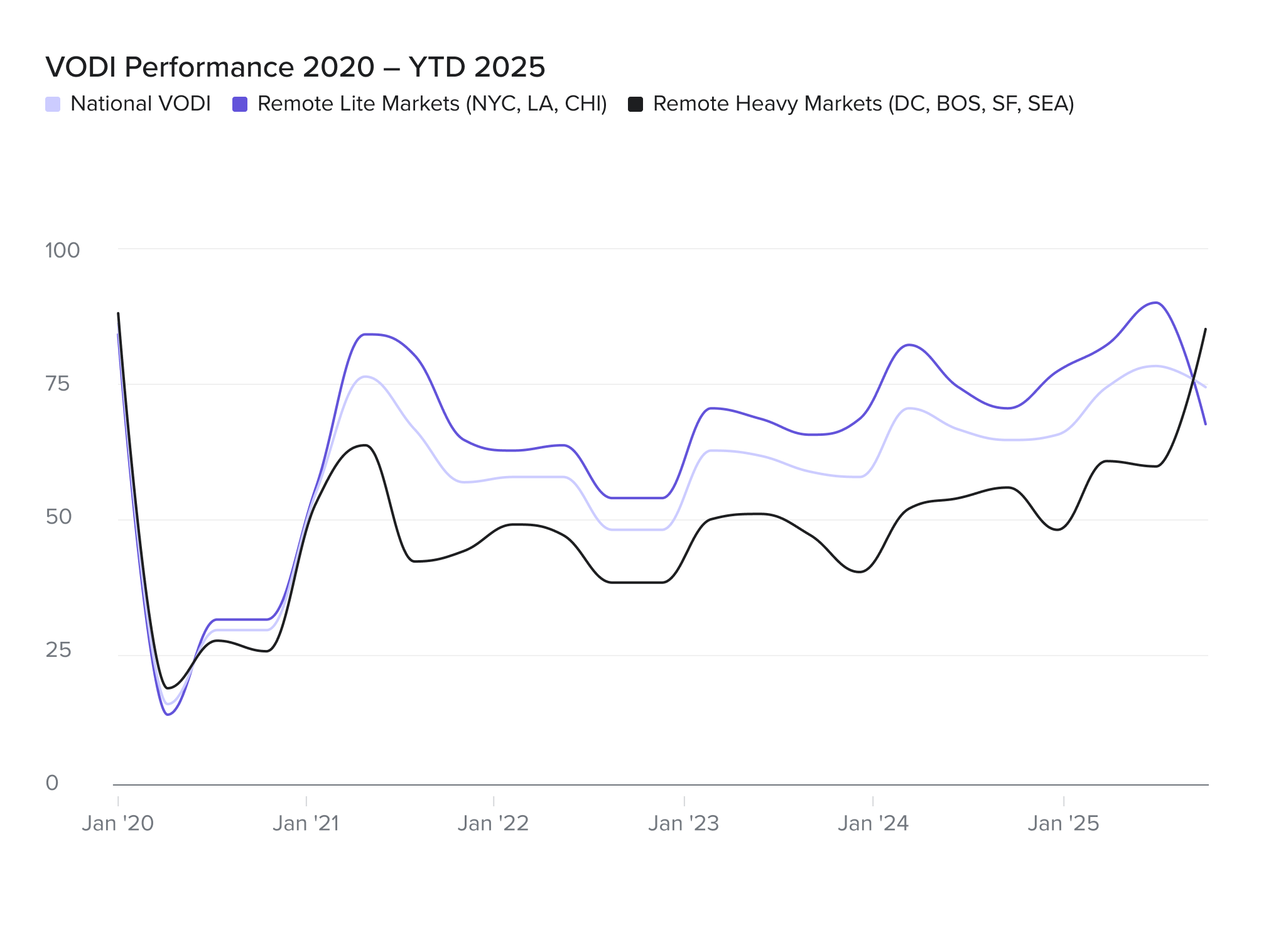 Tech-centric powerhouses led the charge. San Francisco’s VODI continued its climb with a 60 percent quarterly gain, fueled by an AI-driven boom and large tenant demand. Boston executed a reversal from its Q2 slump, with its VODI surging 85 percent as large requirements from the Tech and Legal sectors returned in force.